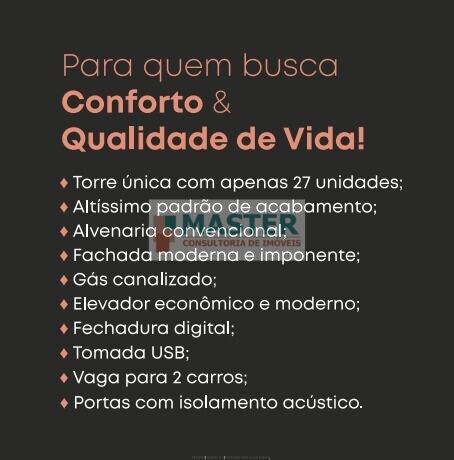 Para quem busca Conforto e qualidade de vida, torre única com 27 unidades, altíssimo padrão de acabamento, alvenaria convencional, fachada moderna e imponente, portas com isolamento acústico. As informações estão sujeitas a alterações. Consulte o corretor responsável.