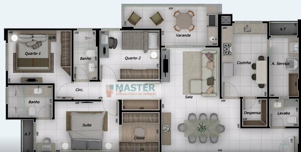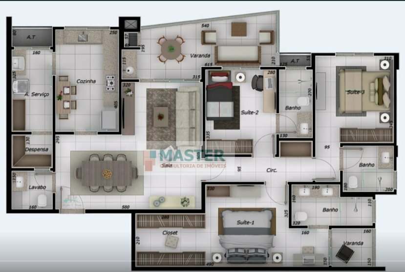 3 Dormitórios, sendo 3 Suítes3 Vagas1 Lavabo1 Sala de jantar1 Área de serviço